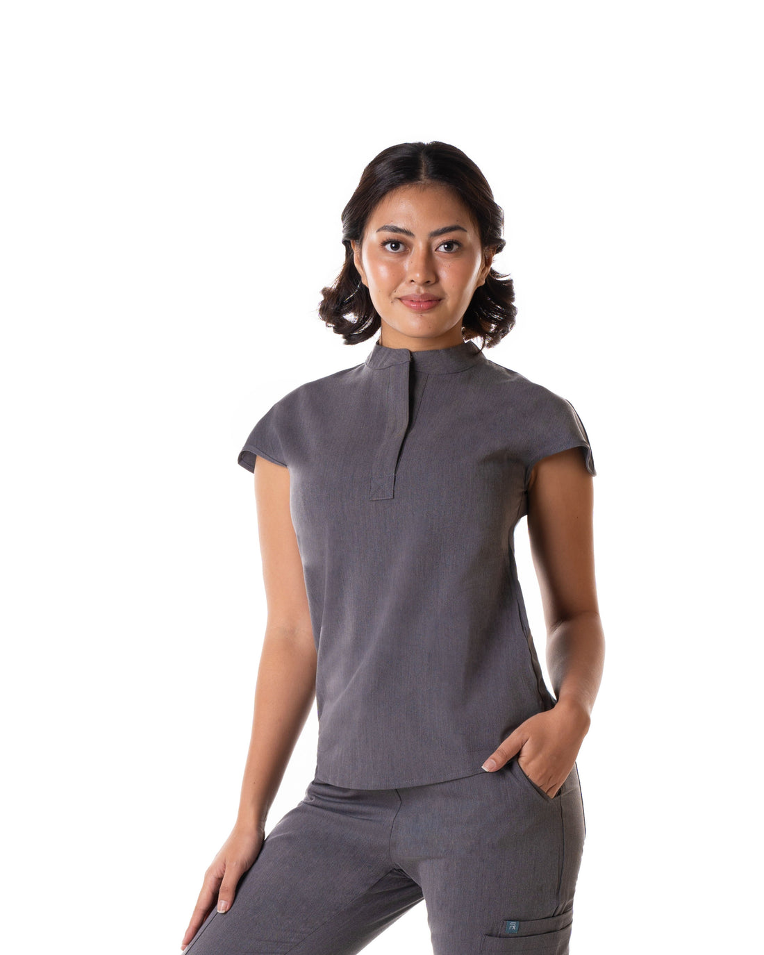 Mandarin collar top with a relaxed fit. This 2 pocket scrub top is made with...